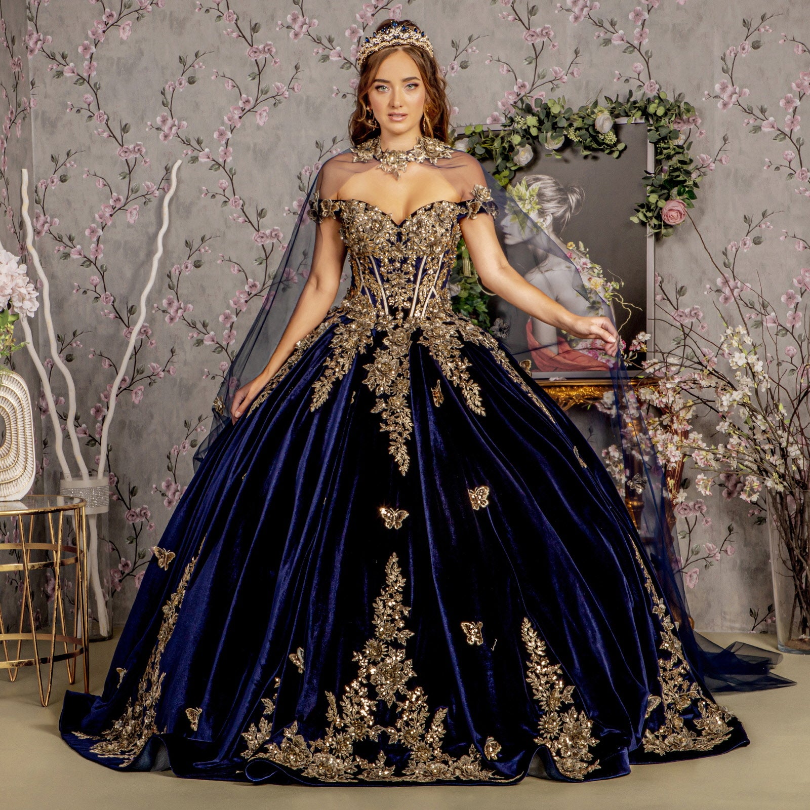 Metallic Embroidery Jewel Velvet Ball Gown w/ Long Mesh Cape